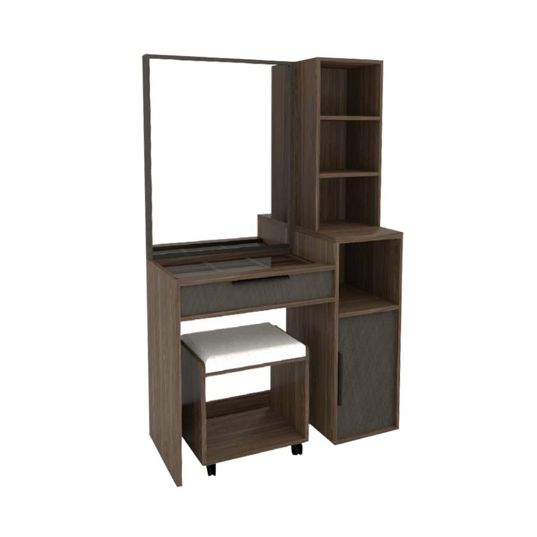 โต๊ะแป้ง + สตูล GRANDIO WD-903 โต๊ะแป้ง + สตูล GRANDIO WD-903  ดีไซน์เรียบหรูในโทนสีเข้มสุดเท่ ช่วยเพิ่มความทันสมัยให้กับห้องนอน ผลิตจากวัสดุคุณภาพ แข็งแรงทนทาน พร้อมกระจกบานใหญ่ให้ภาพสะท้อนชัดเจน มาพร้อมพื้นที่จัดเก็บครบครันทั้งลิ้นชักและช่องเก็บของ ช่วยให้เครื่องสำอางและอุปกรณ์แต่งตัวเป็นระเบียบ หยิบใช้งานง่ายในทุกวัน สตูลเข้าชุดถูกออกแบบให้รองรับการนั่งอย่างสบาย และสามารถเก็บเข้าช่องใต้โต๊ะได้ประหยัดพื้นที่ เหมาะกับการตกแต่งห้องนอนทุกสไตล์